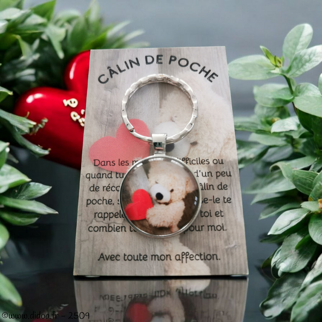 Offrez un peu de réconfort avec notre adorable porte-clés renfermant sous son cabochon en verre un adorable ourson tenant un coeur.