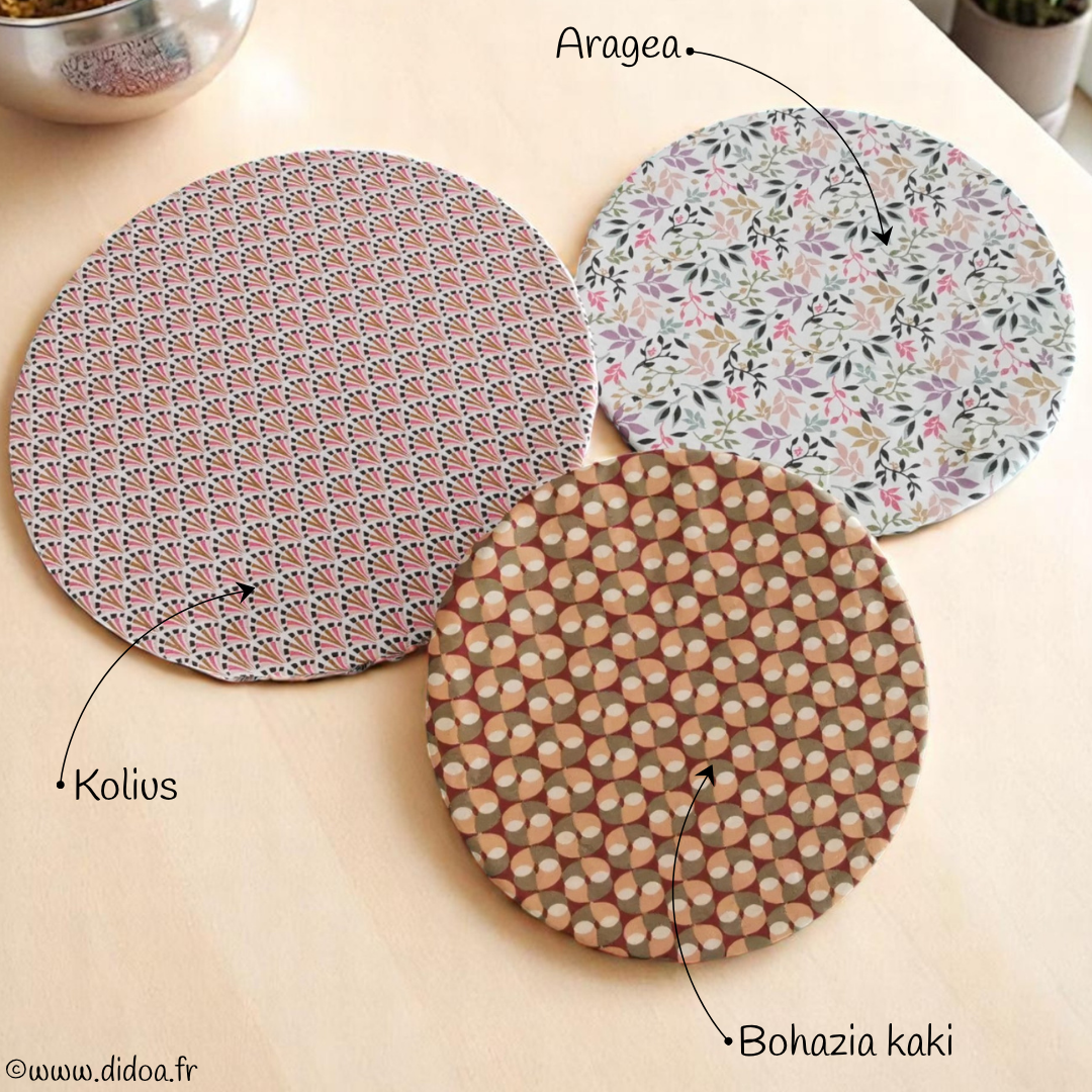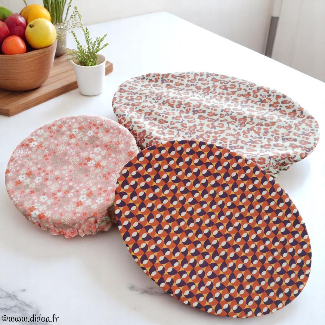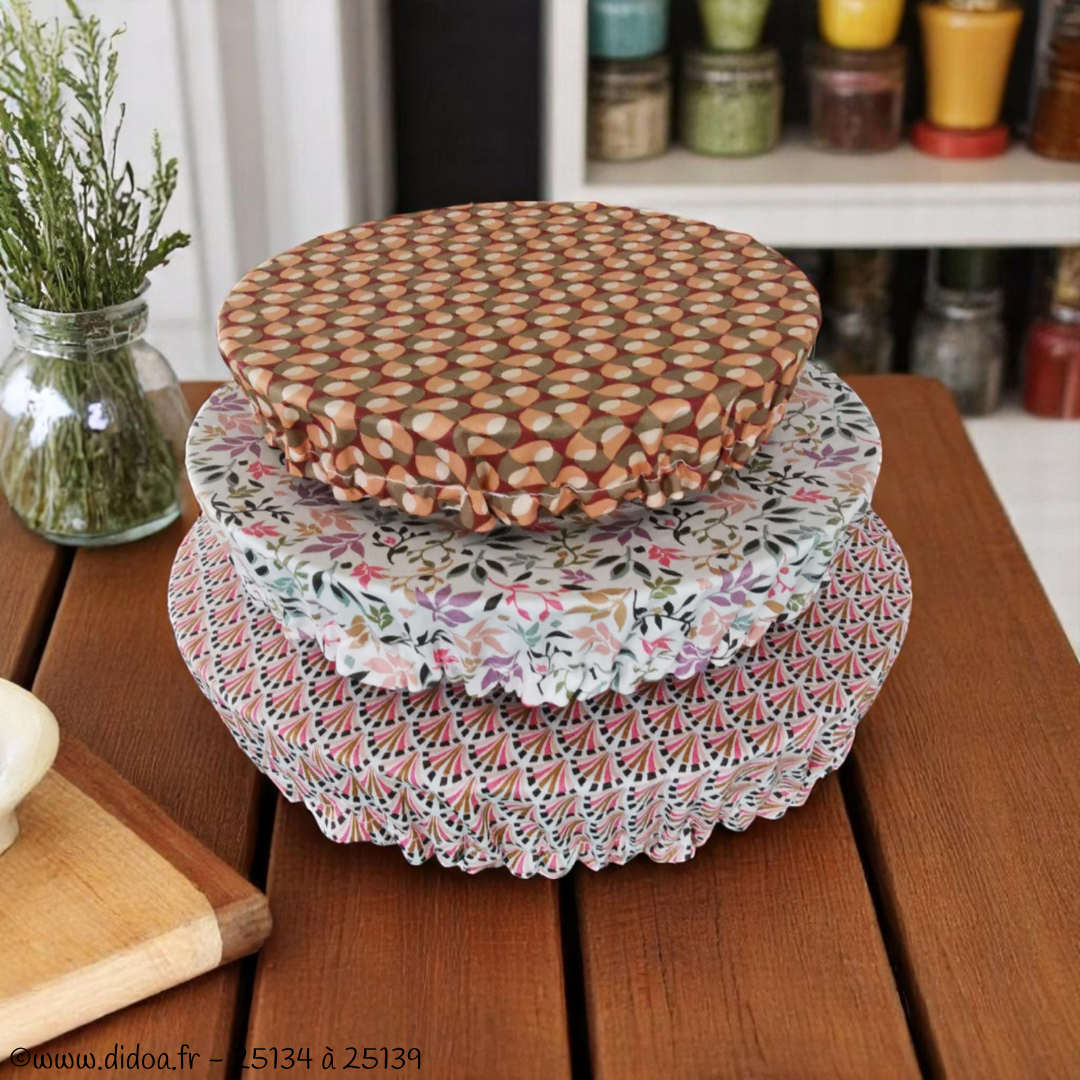 Réutilisables durant des années, les couvre-plats constituent une alternative durable au film plastique jetable vous permettant d'économiser de l'argent à long terme. Fabriqués en coton enduit, ils offrent une excellente conservation des aliments en créant un joint hermétique qui empêche l’air de pénétrer, ce qui aide à préserver la fraîcheur des aliments plus longtemps. Imperméables et respirants, ils conservent vos plats préparés, salades, fromages, fruits, légumes, restes de viandes, pâtes, biscuits...etc et s'adaptent facilement sur différents récipients de forme ronde, ovale et même carrée grâce à leur pourtour élastiqué. Parfaits également lors des repas estivaux (pique-niques, barbecue...), vous n'aurez plus besoin de vous préoccuper des indésirables qui rôdent autour de votre table lors des repas !