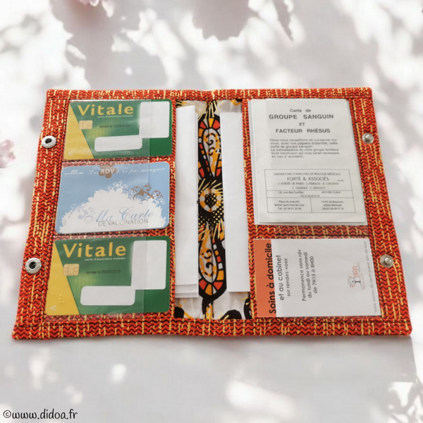 - 5 emplacements transparents : 4 au format carte vitale/carte de visite et 1 plus grand pour la carte mutuelle, carte de groupe sanguin ou les cartons de rendez-vous.